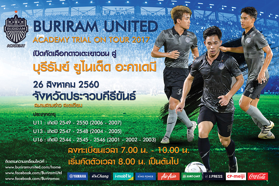 ล่าสุด บุรีรัมย์ ยูไนเต็ด เตรียมขนทัพสตาฟโค้ช มากความสามารถ นำโดย มร.โจเซ่ อัลเวส บอจีส หัวหน้าฝ่ายพัฒนาเยาวชนสโมสรบุรีรัมย์ ยูไนเต็ด และทีมงาน เดินทางล่องใต้ เพื่อเฟ้นหาเพชรเม็ดงาม ในเฟสที่ 2 สนามที่ 2 จังหวัดประจวบคีรีขันธ์ ซึ่งจะมีการคัดเลือกนักเตะเยาวชน ในวันเสาร์ที่ 26 สิงหาคม 2560 ที่สนามสามอ่าว สเตเดียม